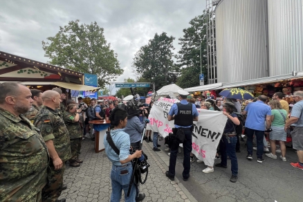 Erstmals wird in Deutschland am 15. Juni der sogenannte Nationale Veteranentag begangen. Auch auf dem Hessentag in Bad Vilbel wurden in einem Zelt der Bundeswehr Soldat:innen, und damit auch die deutsche Militärgeschichte, geehrt. Im Rahmen bundesweiter Proteste gegen den Veteranentag führte die Frankfurter Ortsgruppe der Interventionistischen Linken (IL) zu Beginn der Veranstaltung mit Boris Rhein eine Störaktion durch.